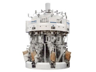 储袋输送链将成组的阀口袋送至取袋机构处, 机械手将阀口袋送入等待工位, 真空吸附抓手自动连续取袋送入插袋机构, 插袋机构使阀口张开后迅速插入旋转式灌装口, 定量灌装系统 开启, 灌装完成后自动掉袋落入输送带, 传送至码垛机自动堆积, 便于叉车运至仓库储存。