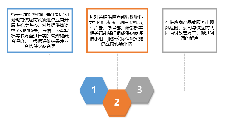 公司灵活搭建供应商评估体系,定期组织合格供应商的选择评审工作,鼓励供应商通过质量、环境等权威管理体系的认证,特别是为公司提供关键产品或服务的供应商,对其社会责任相关的管理会有更加具体严格的要求,并及时跟踪供应商遵守协议的情况,全面说明其在社会和环境方面的行为措施。此外,公司在采购合同中明确要求供应商需要提供达到相关环保要求的原材料,并优先选择对环境影响低的原材料供应商。2021年,公司使用环境和社会标准筛选的供应商共计778家。