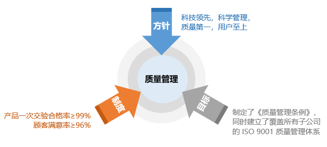 公司扎实贯彻“科技领先,科学管理,质量第一,用户至上”的经营方针,制定了《质量管理办法》,同时建立了覆盖所有子公司的ISO9001质量管理体系,梳理完善各产品门类质量检验规范,完善各级质量管理人员组织架构,配备适宜的质量管理人员,全面提升公司质量管理水平。